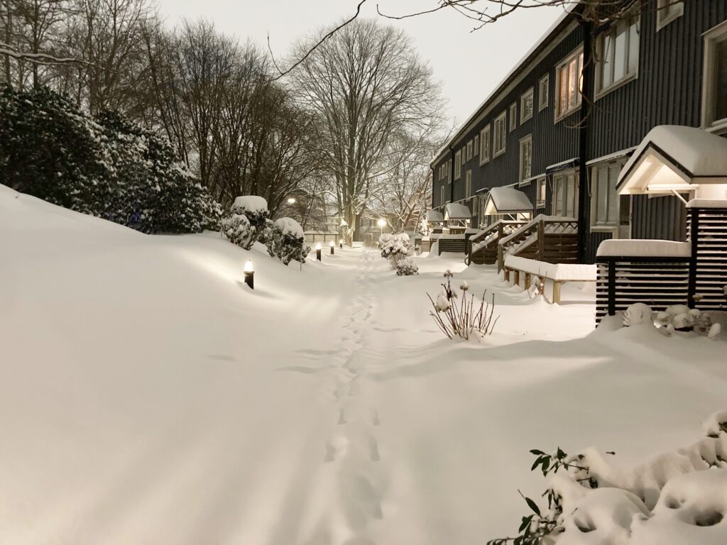 - Sist ut är entréer och själva gångbanan. Då vi inte själva har tillgång till någon traktor utan bara egna snöskyfflar så är det oftast rimligt att invänta ordinarie snöskottare som kommer tids nog. Vi har ju tak över själva entréerna så ut kommer man och dörrarnas funktion brukar fungera andå.